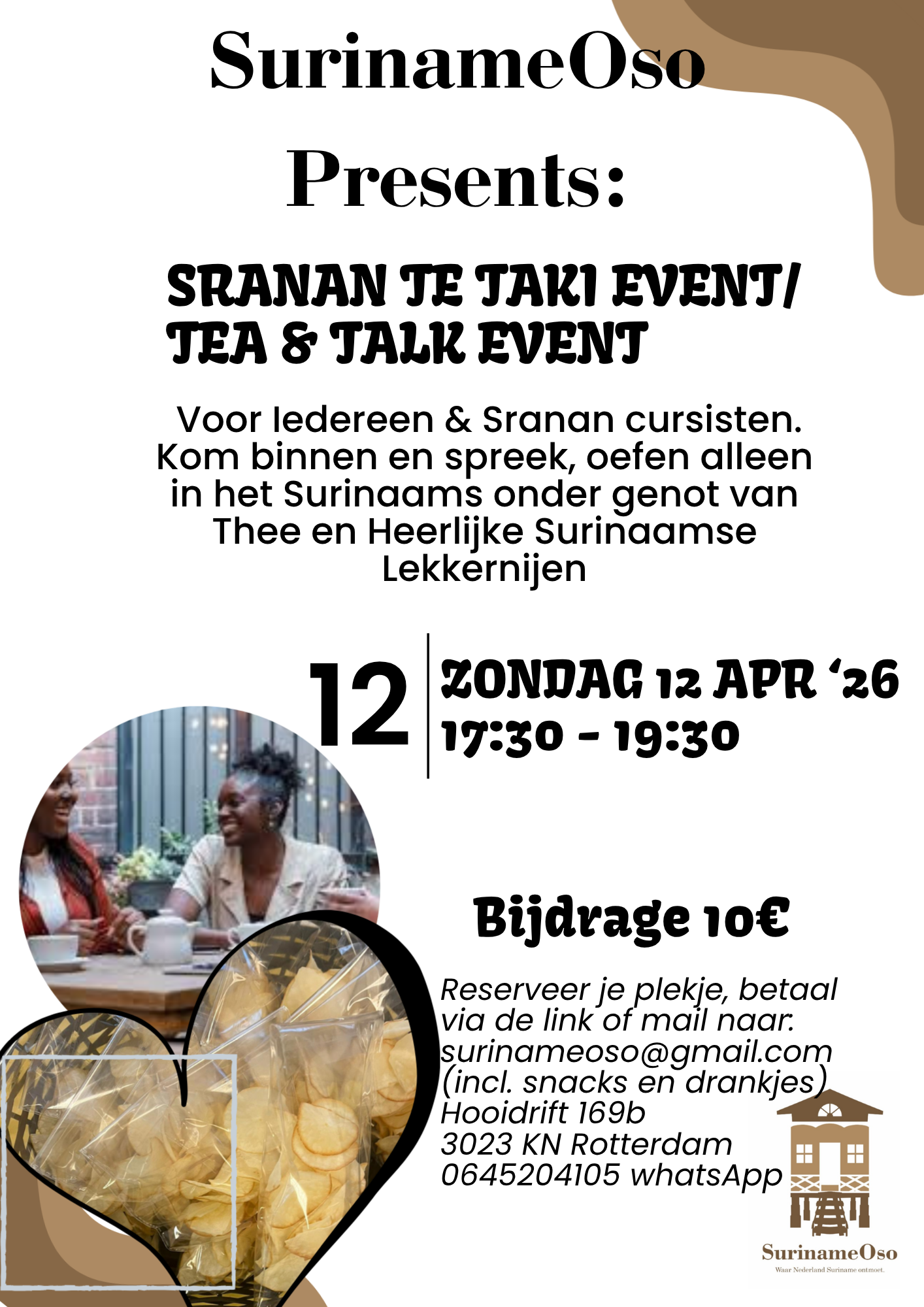 Een gezellige Thee en Taki Sranan Evenement voor Sranan Cursisten en Iedereen, die de Surinaams taal een warm hart toedraagt. Kom binnen, spreek & oefen alleen in het Surinaams onder genot van Thee en Heerlijke Surinaamse Lekkernijen.